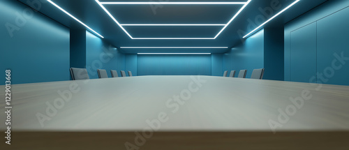 Fototapeta premium conference room blue background, wooden table, high-end chairs, and soft lighting
