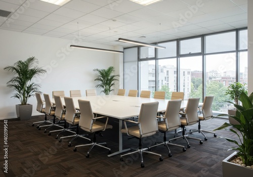 © Laki, Obraz premium Conference room with large table and chairs near windows and plants in a modern office space