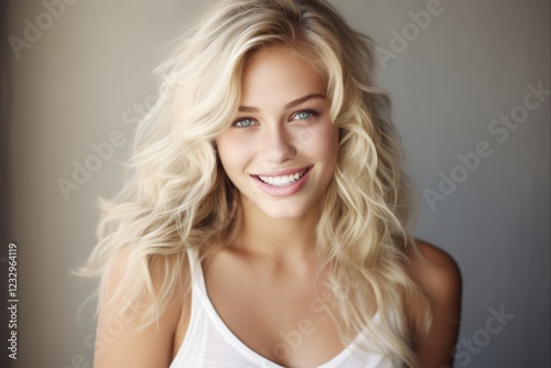 © Vlad, Fototapeta premium Confident and Gorgeous Head Shot of Attractive Blonde Woman with Flirty Grin and Glowing Skin - Perfect for Commercial Use
