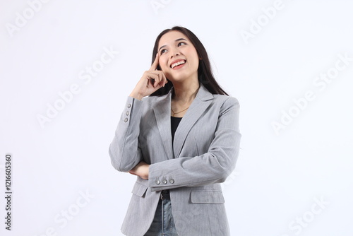 Fototapeta premium Confident Asian businesswoman in a gray blazer, thinking creatively with a bright smile