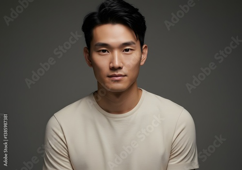© JARVIS X, Fototapeta premium Confident Asian Man Portrait Calm Expression, Neutral Background, Short Black Hair, Beige T-Shirt.