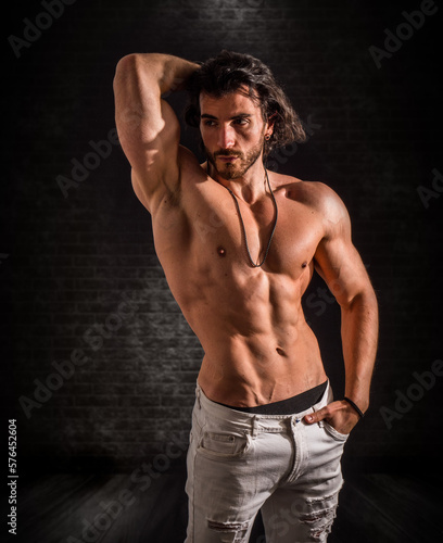 Fototapeta premium Confident, attractive shirtless muscular young man with open vest on