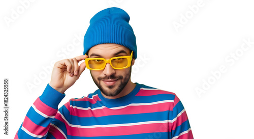 © Kalek, Fototapeta premium Confident bearded man with colorful striped shirt and blue beanie adjusting yellow frame sunglasses against a stark black background looking forward with playful expression fashion concept