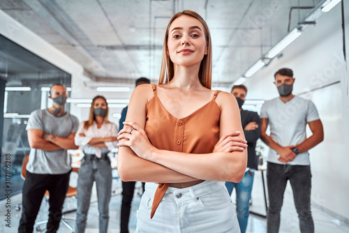 © HBS, Naklejka premium Confident business people with face mask protect from Coronavirus or COVID-19.