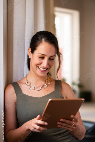 © Vergani Fotografia, Fototapeta premium Confident business woman checking report on digital tablet in coworking open space. Strategy, information, professional, corporate concept..