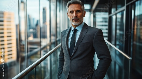 © Sirat, Naklejka premium Confident businessman in a modern office building, standing near glass walls with city skyline view, wearing a suit, professional attire, career success