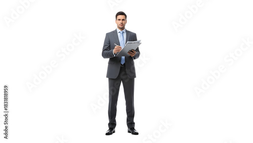 © Mounya, Obraz premium Confident businessman in a suit holding a clipboard and pen, ready to make notes