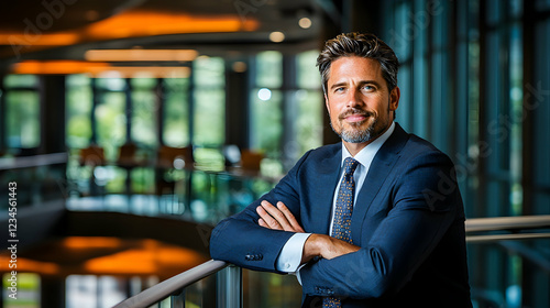 © BROPRADANA, Fototapeta premium Confident businessman, modern office, lobby background, portrait