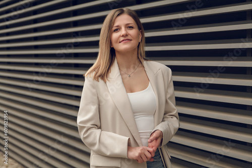 Fototapeta premium Confident businesswoman standing near striped wall