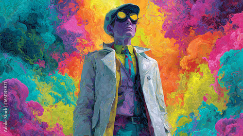 © OCTOLENS, Obraz premium Confident character in cool coat and sunglasses stands before an explosion of vibrant colorful powder. surreal, fashionable, psychedelic background for creative concept