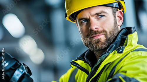 Obraz premium confident construction worker wearing yellow hard hat and high visibility jacket, showcasing safety and professionalism in industrial setting