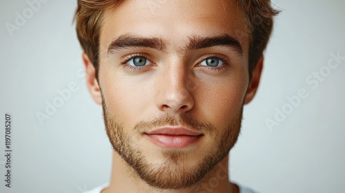 © zakir, Fototapeta premium Confident European Man in White Soccer Jersey with Buzzcut and Beard Against Grey Background