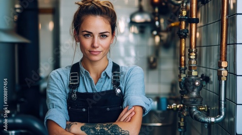 © Riko, Fototapeta premium Confident female barista in coffee shop. Studio portrait with industrial background