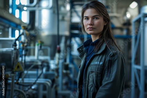 © movinglines.studio, Fototapeta premium Confident Female Engineer in Industrial Facility Wearing Green Jacket