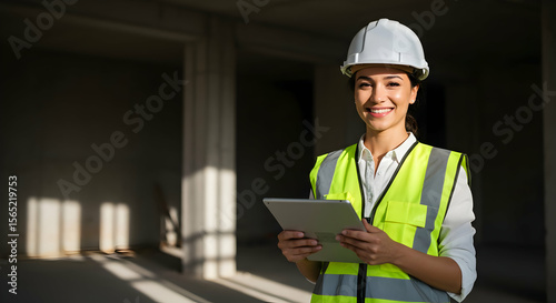 © Muhammad, Fototapeta premium Confident female engineer using tablet on construction site smiling at camera successful businesswoman architect building project management industry