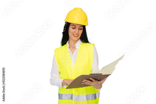 Fototapeta premium Confident female engineer wearing safety vest and helmet reviewing documents on a transparent background