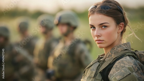 © Evon J, Fototapeta premium Confident Female Soldier with Troop in Background. Veterans Day