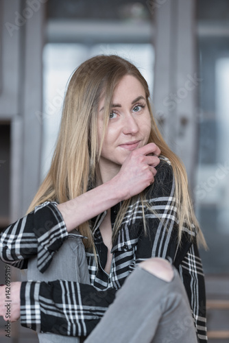 © Mindaugas Dulinskas, Fototapeta premium Confident Female with Long Hair in Black and White Shirt Indoors