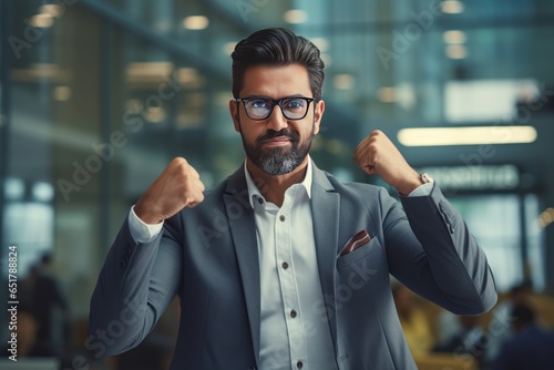 © CYBERUSS, Naklejka premium Confident Indian Businessman Showing a Fighting Pose, Handsome Manager Gestures Raising Fists in Modern Office, Male Entrepreneur Celebrating Success.