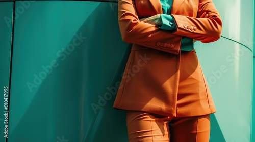 Fototapeta premium Confident Individual Dressed in Orange Suit Leaning Against Turquoise Wall in...