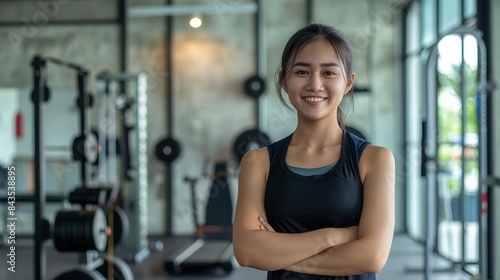 Obraz premium Confident Indonesian Female Fitness Trainer in Gym Setting, Ideal for Fitness, Wellness, and Health Promotion