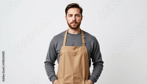 © K-MookPan, Fototapeta premium Confident Male Model in Apron Posing for Portrait Against White Background
