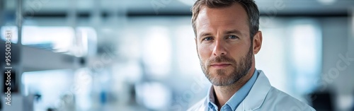 © BG_Illustrations, Fototapeta premium Confident Male Scientist Posed in Vivid Laboratory Setting