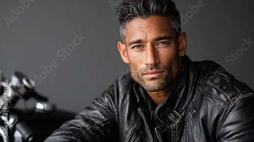 Obraz premium Confident man posing with motorcycle while wearing black leather jacket