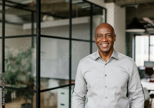 © Anna, Fototapeta premium Confident man smiling in modern office with glass partitions and indoor plants