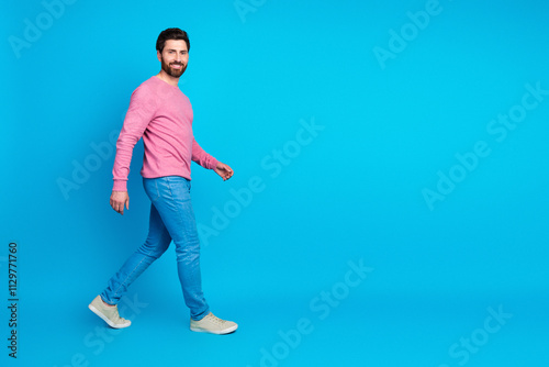 Naklejka premium Confident man walking casually in stylish outfit against a vibrant blue...
