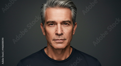 Naklejka premium Confident man with gray hair looks directly at the camera, conveying wisdom and maturity. He's an inspiration, embodying strength.