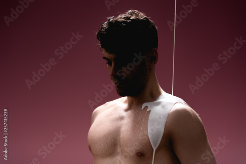 Fototapeta premium confident man with white paint spills on body on purple