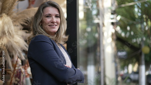 Fototapeta premium Confident mature female entrepreneur standing in front of local small...