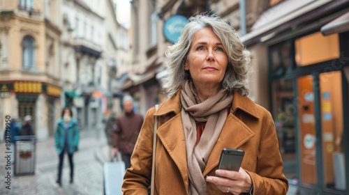 © Maestro, Fototapeta premium Confident mature woman with smartphone walking in European city street