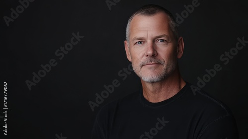 © J. Grayscale, Fototapeta premium Confident Middle-Aged Man in Black Shirt Against Dark Background