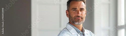 Fototapeta premium Confident Middle-Aged Man with Gray Hair and Beard Standing in Bright Modern...