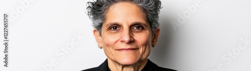Fototapeta premium Confident Middle-Aged Woman with Short Curly Hair Against Plain White Background Smiling Gently