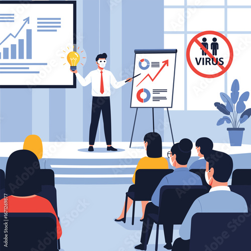 © Kamrul, Obraz premium Confident presenter shares idea with masked audience during safe business meeting and strategy presentation.