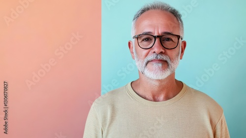 © J. Grayscale, Obraz premium Confident Senior Man with Glasses Against a Colorful Background