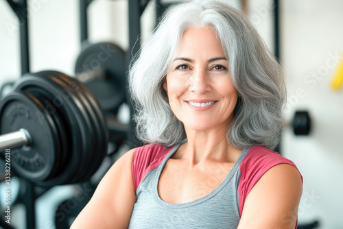 © Victor, Obraz premium Confident senior woman in gym staying fit and active with strength training, promoting healthy aging, wellness, and motivation.