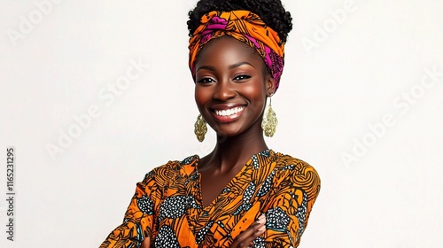 © WS Studio 1985, Fototapeta premium Confident Smiling African Woman with Arms Crossed in Colorful Attire