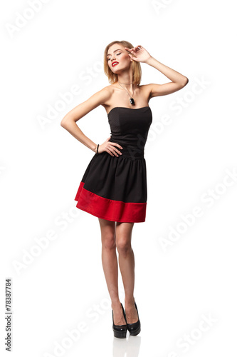 © Chernenko Timofey, Fototapeta premium Confident smiling elegant woman in dress standing in full length