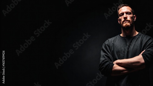 © Prapan, Naklejka premium Confident Stance of A Man: A muscular, focused man, exudes strength and determination as he stands in front of a solid dark backdrop, embodying self-assurance and inner resilience.