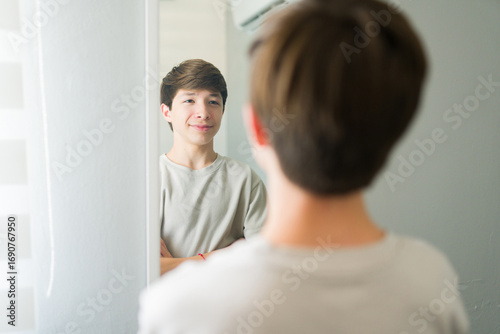 Obraz premium Confident teenager looking at his reflection in bedroom mirror