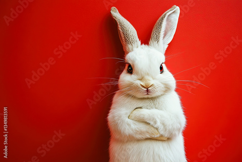 © Alexandra, Obraz premium Confident White Rabbit on Red Background