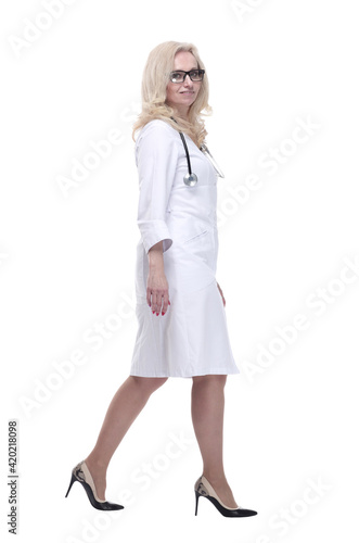 Fototapeta premium confident woman doctor striding forward. isolated on a white