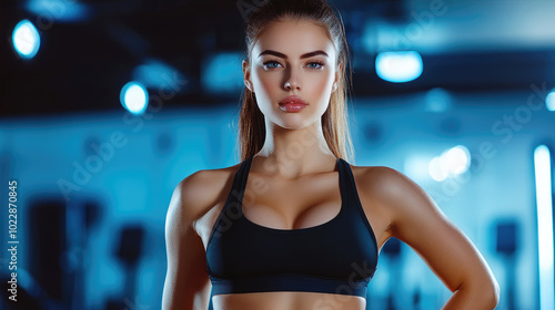 Fototapeta premium Confident woman in black sportswear posing in a modern gym environment