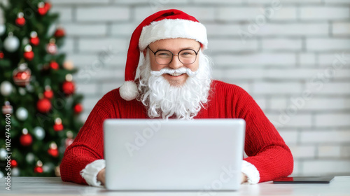 © Piya W., Naklejka premium Confident young businessman Santa Claus working in online store for business Small business owner at his desk online shop christmas sale SME and dropshipping