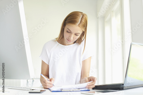 © gzorgz, Fototapeta premium Confident young businesswoman working at office desk. Home office