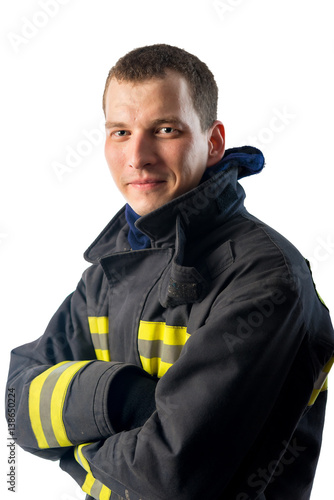 © kosmos111, Fototapeta premium confident young Fireman on white background in studio